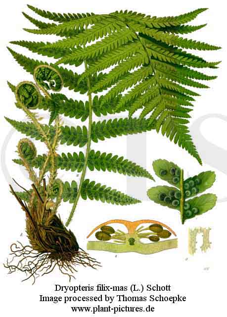 Stammpflanze: Dryopteris filix-mas (L.) SCHOTT. / Gemeiner Wurmfarn [Fam. Dryopteridaceae / Wurmfarngewächese]. |